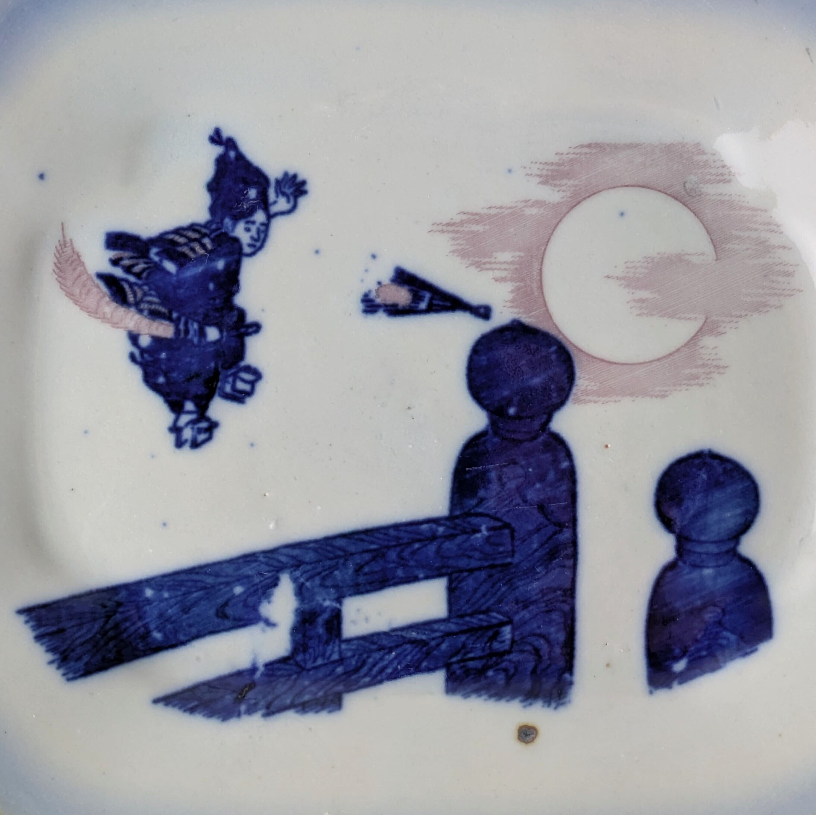 明治末~大正時代 銅版染付牛若丸五条大橋図角皿